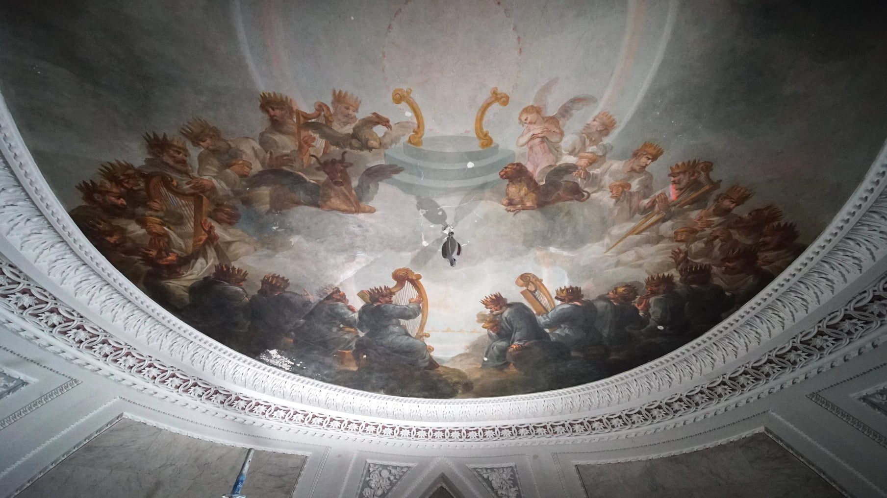A intervenção no restauro capela Prado Repouso incide sobre fixação, limpeza e consolidação. Focamo-nos especialmente nas pinturas e elementos decorativos. Damos atenção especial ao medalhão central — única secção remanescente da pintura original.