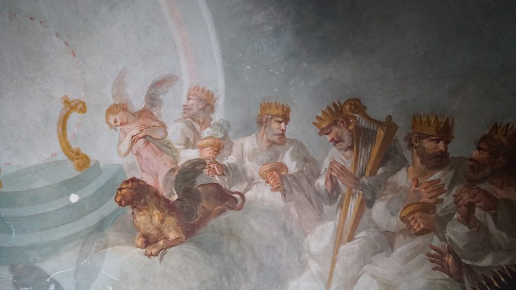 Posteriormente, durante a análise técnica, a equipa identificou o medalhão central como a única secção remanescente da pintura original. Indubitavelmente, esta composição representa a Adoração da Sagrada Espécie, rodeada pelos símbolos dos quatro evangelistas: anjo, leão, touro e águia.